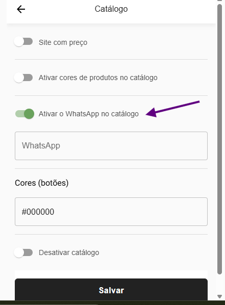 Localize e ative a opção “Ativar WhatsApp no catálogo”.
