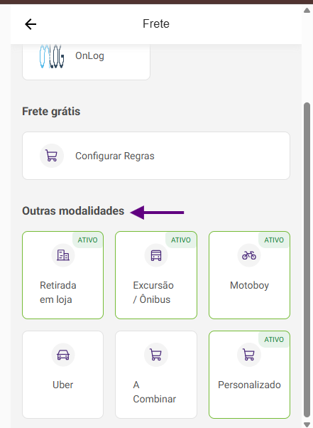 3️⃣ Na tela de frete, localize a seção “Outras modalidades”.