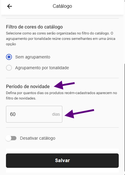 O período de novidade define por quantos dias um produto será considerado novo no catálogo. Esse período é utilizado no filtro Novidades, facilitando a visualização dos lançamentos mais recentes.