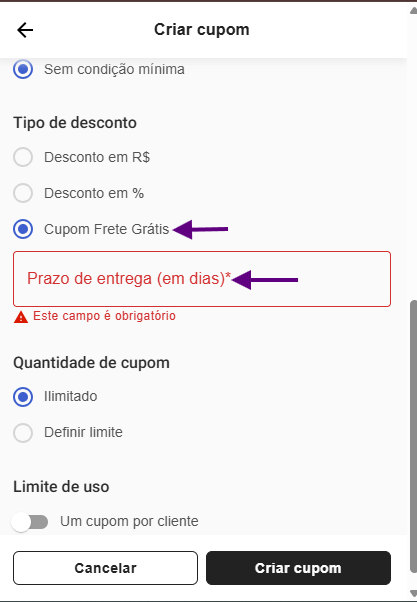 Agora você pode criar cupons que oferecem frete grátis aos seus clientes. Além disso, é possível informar o tempo médio de entrega, deixando a experiência de compra mais clara e transparente. 💜