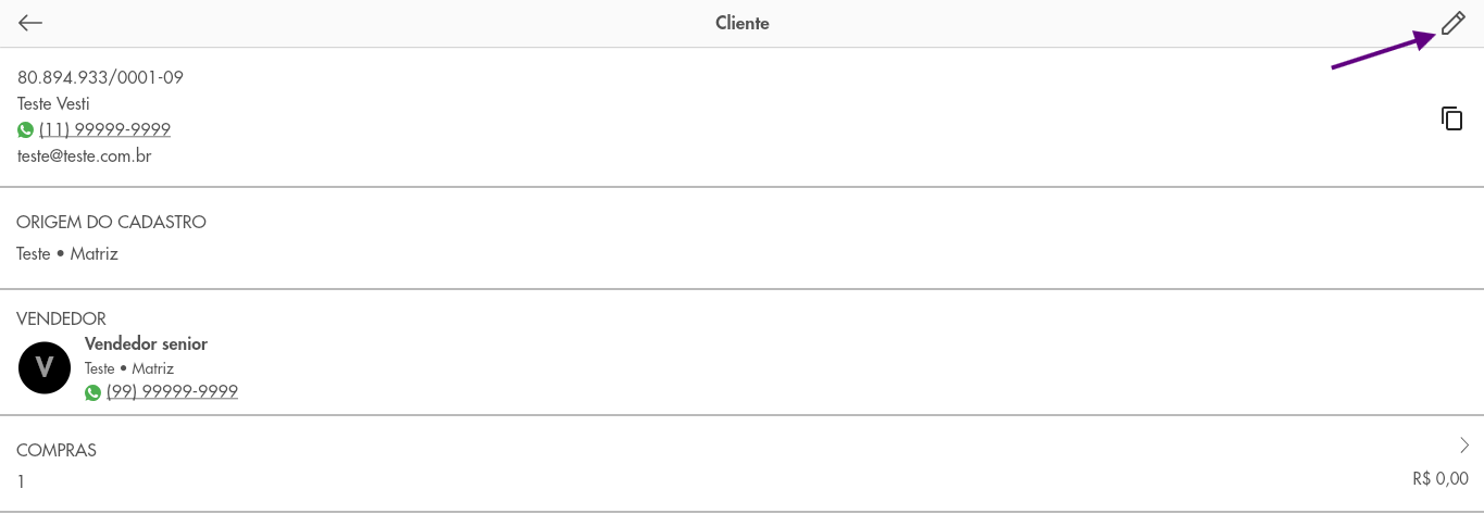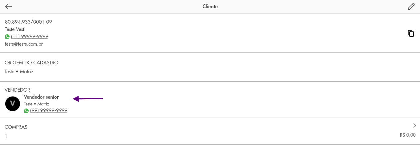 5️⃣ Na tela do cliente, você verá todas as informações cadastrais, incluindo o vendedor atual.