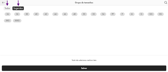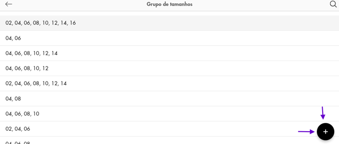- Clique no + para adicionar um novo grupo de tamanhos.