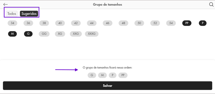 O grupo de tamanhos ficará exatamente nessa ordem.