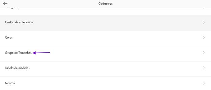 - Dentro de Cadastros, clique em Grupo de Tamanhos.