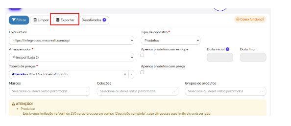 Selecione um armazenador, uma tabela de preço, se quiser pode marcar apenas produtos com estoque e apenas produto com preço. Clique em Filtrar