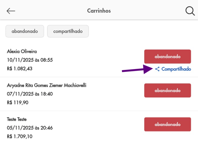 Ao compartilhar, o carrinho permanece com o status “Abandonado”, mas passa a exibir também um status de “Compartilhado”.