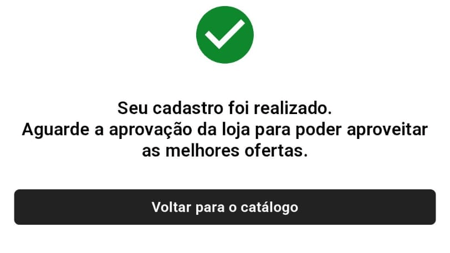 Após finalizar o cadastro, o cliente verá uma mensagem informando que é preciso aguardar a liberação do catálogo.